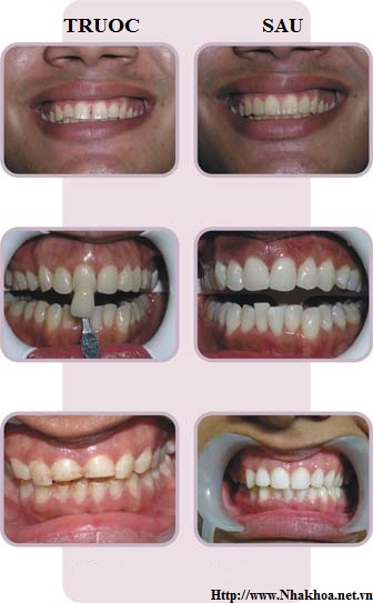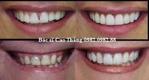 2. Phủ men răng bằng Composite: Men răng ở mặt trước các răng lộ khi cười ( thường khoảng 8 đến 10 răng cửa hàm trên cũng như hàm dưới ) được lấy đi một lớp khoảng 0,5 đến 1,2 mm do bác sĩ tính toán. Composite được trám phủ lên bền mặt ngoài các răng này, màu trắng của lớp chất liệu này sẽ đại diện cho màu của răng khi giao tiếp. Ưu điểm của phương pháp này là thao tác nhanh ngay trên miệng bệnh nhân 3-5 phút/răng. Độ bền 3 đến 5 năm. Độ trong và sắc độ mà composite đem lại tương đương với 6/10 so với răng thật